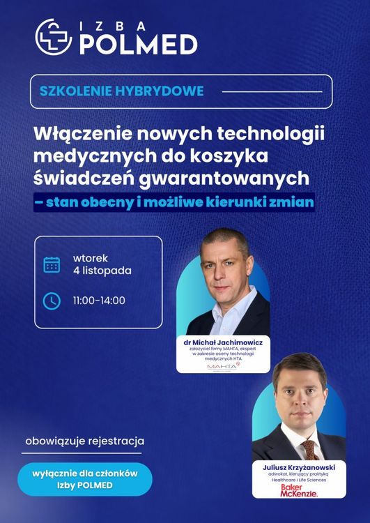 Izba POLMED wraz z kancelarią Baker McKenzie Polska oraz MAHTA Sp. z o.o. zapraszają na warsztat: ,,Włączanie nowych technologii medycznych do koszyka świadczeń gwarantowanych''.