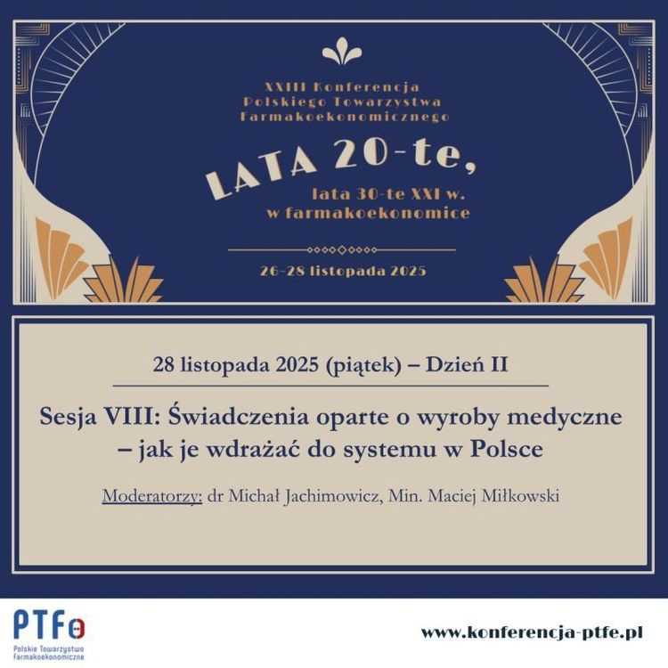 28 listopada 2025 również w trakcie XXIII Konferencja Polskiego Towarzystwa Farmakoekonomicznego, odbędzie się Sesja VIII: ,,Świadczenia oparte o wyroby medyczne – jak je wdrażać do systemu w Polsce’’.