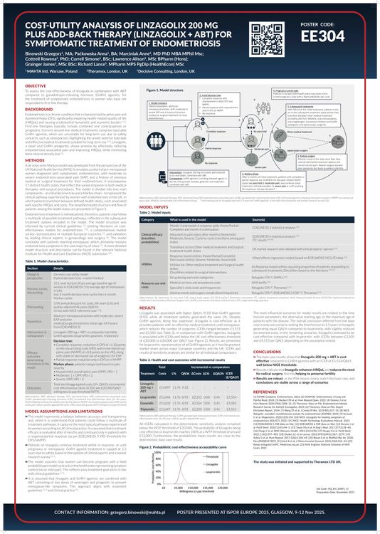 W trakcie konferencji ISPOR Europe 2025 w Glasgow Grzegorz Binowski z zespołu MAHTA Intl. zaprezentował wyniki projektu badawczego przeprowadzonego przez MAHTA Intl. wspólnie z Theramex i Decisive Consulting, poświęconego ,,Analizie użyteczności kosztowej linzagolixu 200 mg stosowanego z równoległą terapią hormonalną w objawowym leczeniu endometriozy’'. Zespół MAHTA Intl. był odpowiedzialny za opracowanie ram koncepcyjnych oraz przeprowadzenie kluczowego modelowania i analizy w tym projekcie.