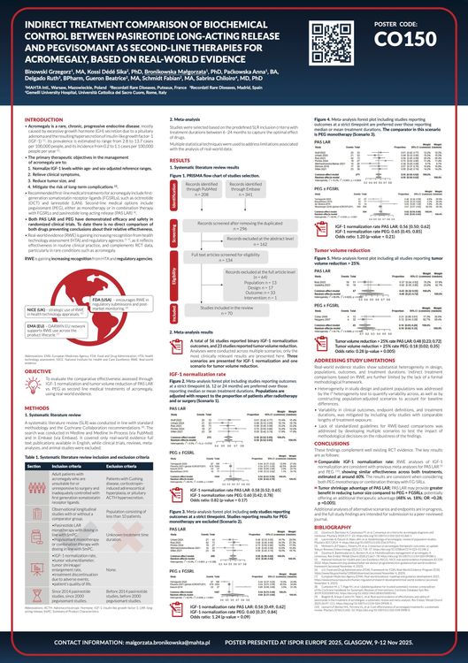 W czasie konferencji ISPOR 2025 w Glasgow w dniach 9–12 listopada Małgorzata Bronikowska z zespołu MAHTA Intl. zaprezentowała pracę pt. „Porównanie pośrednie skuteczności leczenia pasyreotydem i pegwisomantem, stosowanych w drugiej linii leczenia akromegalii: analiza oparta na danych z praktyki klinicznej”, która powstała we współpracy z Recordati Rare Diseases oraz prof. Sabriną Chiloiro.